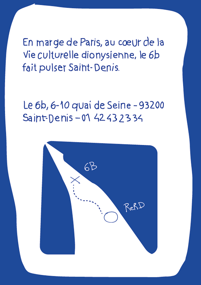 Le 6b est un lieu de création et de diffusion installé dans un ancien bâtiment industriel de 7000m2 basé à Saint-Denis. Le 6b permet à tous d’accéder à une culture, grâce à ses événements (concerts, débats, performances, expositions...) et à son accès à 170 ateliers tenus par de divers professionnels à prix abordables. On peut y retrouver des graphistes, musiciens, cinéastes, artisans, travailleurs sociaux, comédiens, danseurs, peintres, sculpteurs, architectes... Parmi les événements proposés par le 6b : La Fabrique à rêves qui exploite les 3000m2 de la plage du 6b pour réinventer le bâtiment en espace ludique, festif et créatif. Au programme : concerts, DJ sets, performances, danse, street art, ateliers, expositions... Le 6b héberge également des événements de manière hebdomadaire, tels que des cours de sport, des expositions d’art en tout genre, des projections, ateliers artistiques... Consultables sur le site du 6b, à l’onglet Agenda.