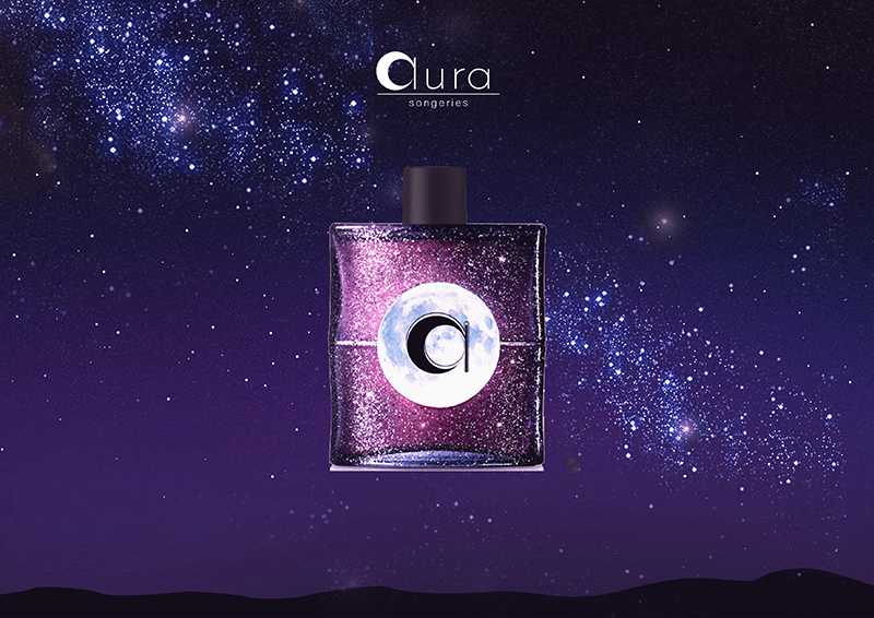 AURA est une marque de parfum céleste. elle tire son identité du ciel, de la nuit, des étoiles, de la lune, du rêve. Le logotype reprend donc un croissant de lune, et la baseline choisie reflète le côté onirique de la marque fictive.